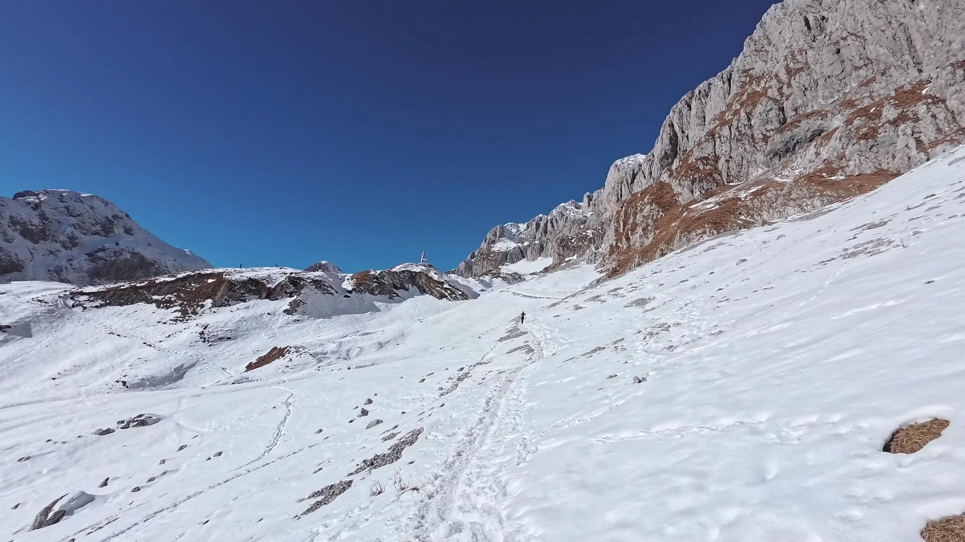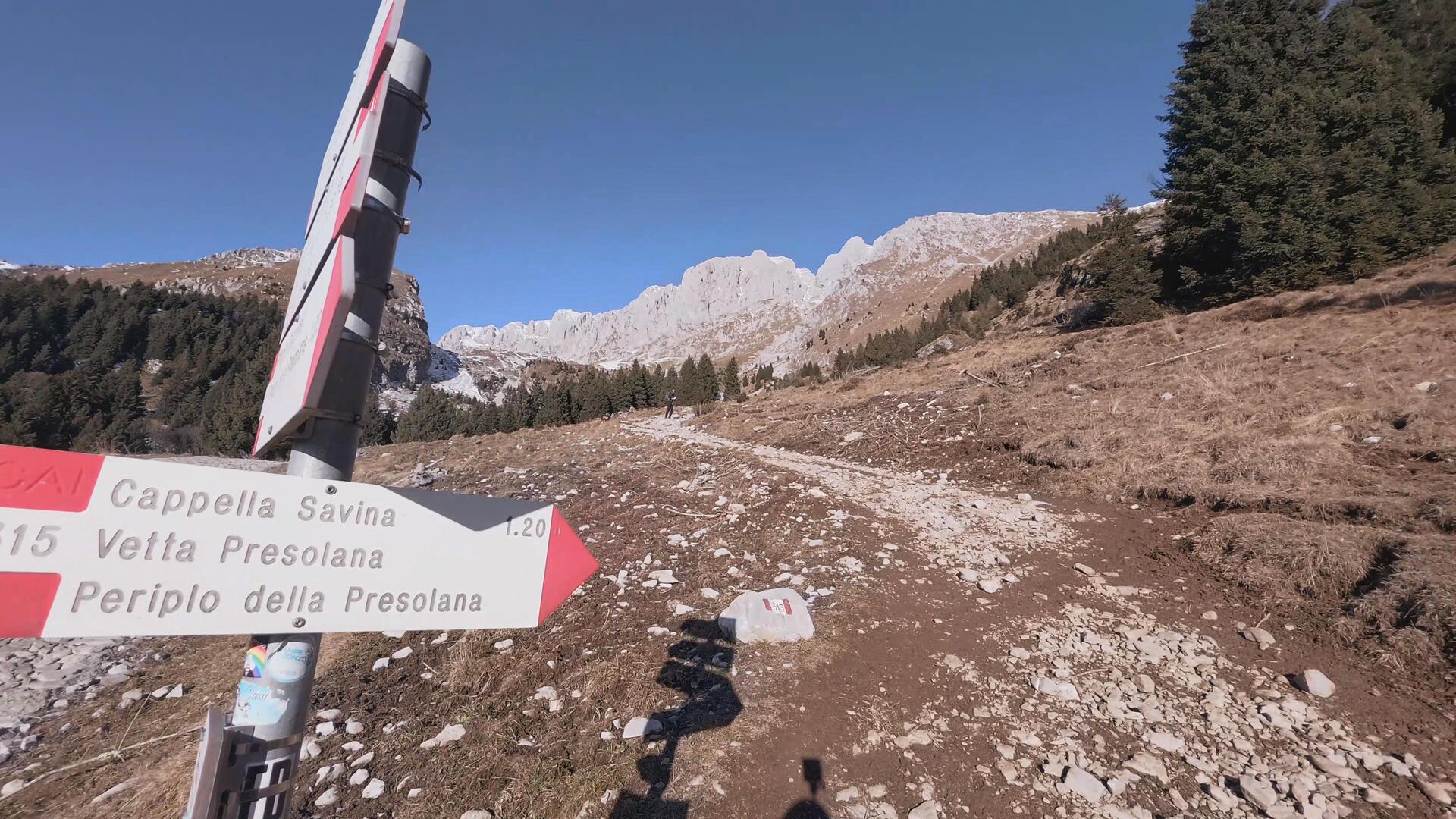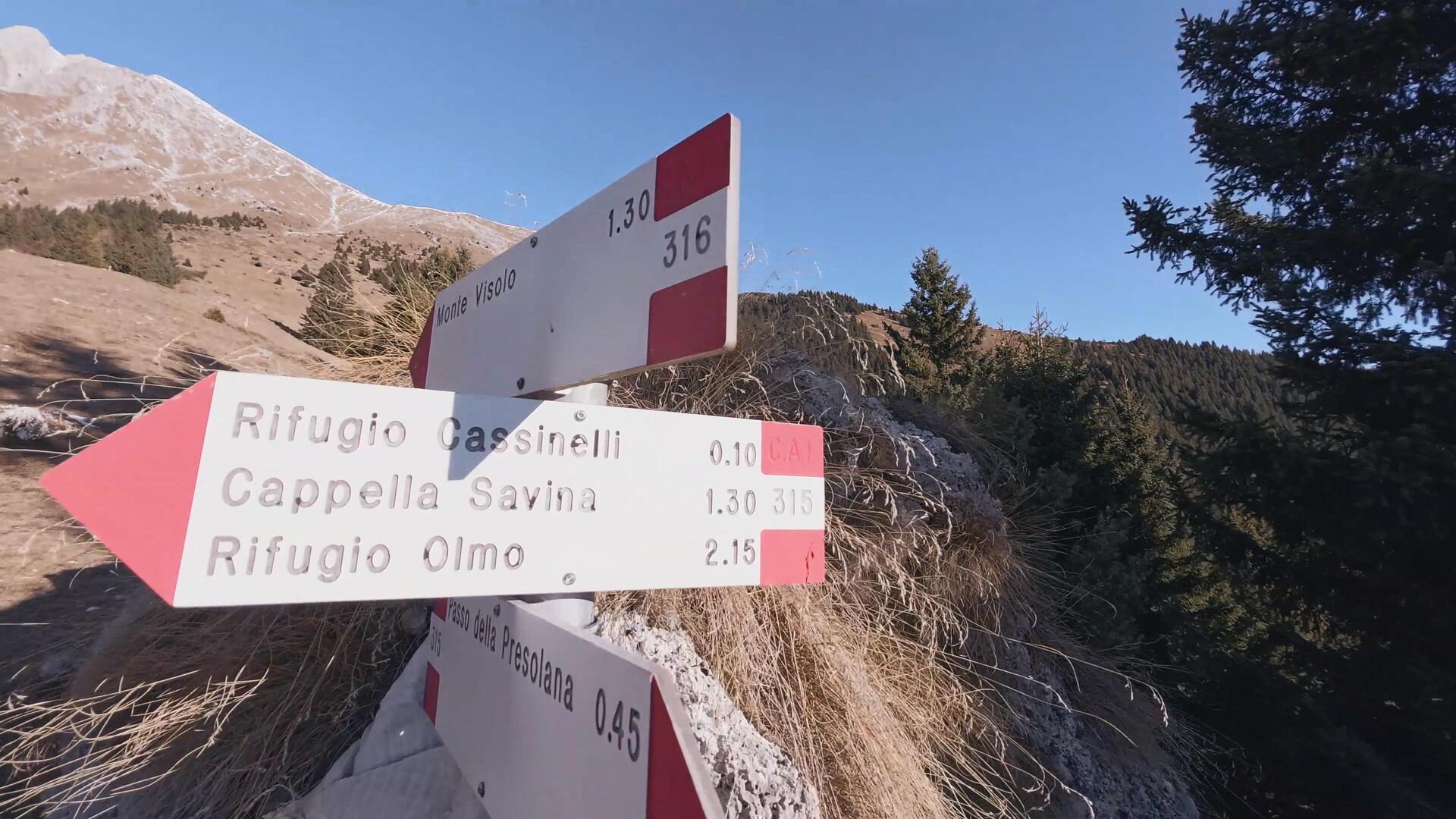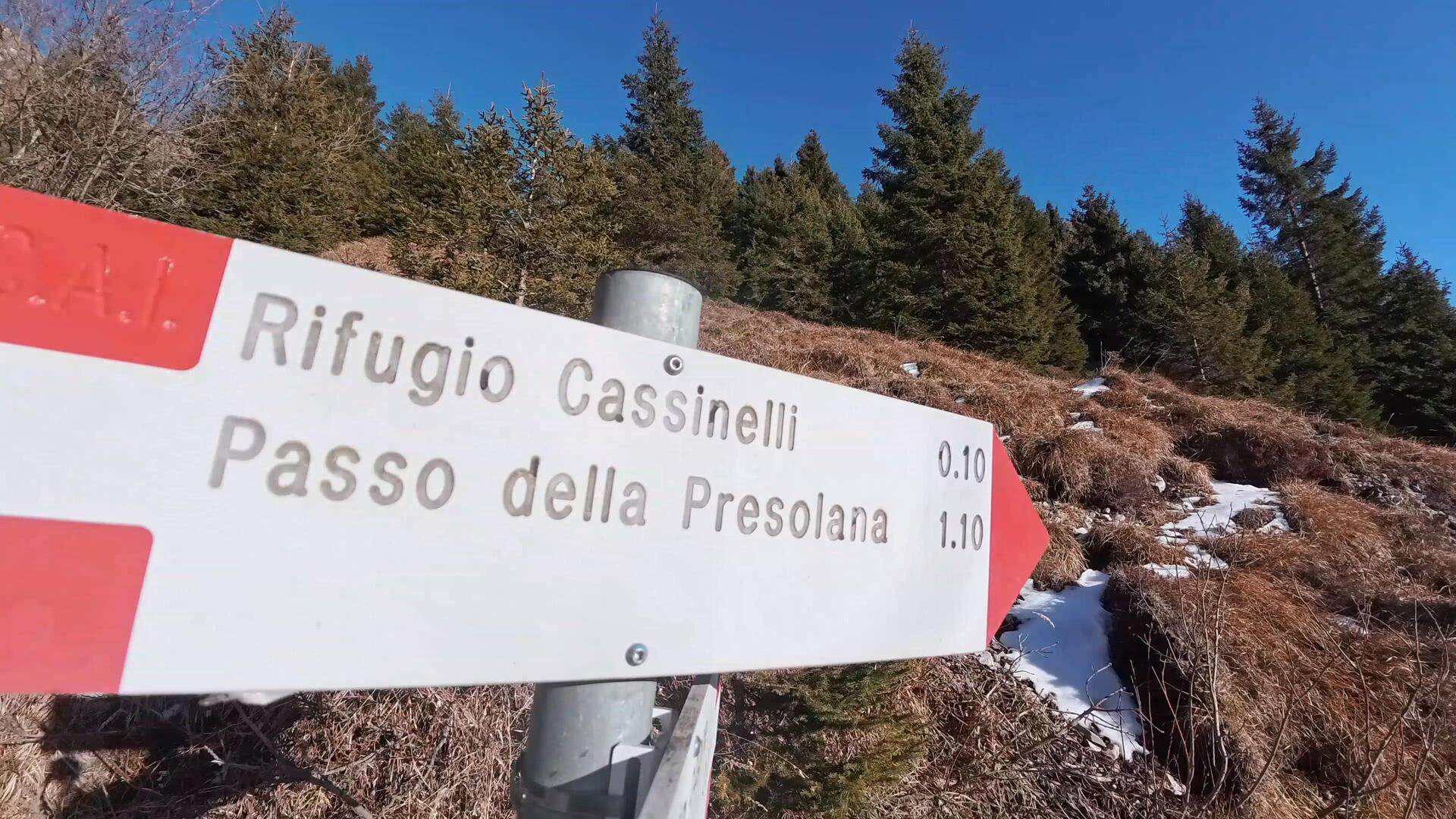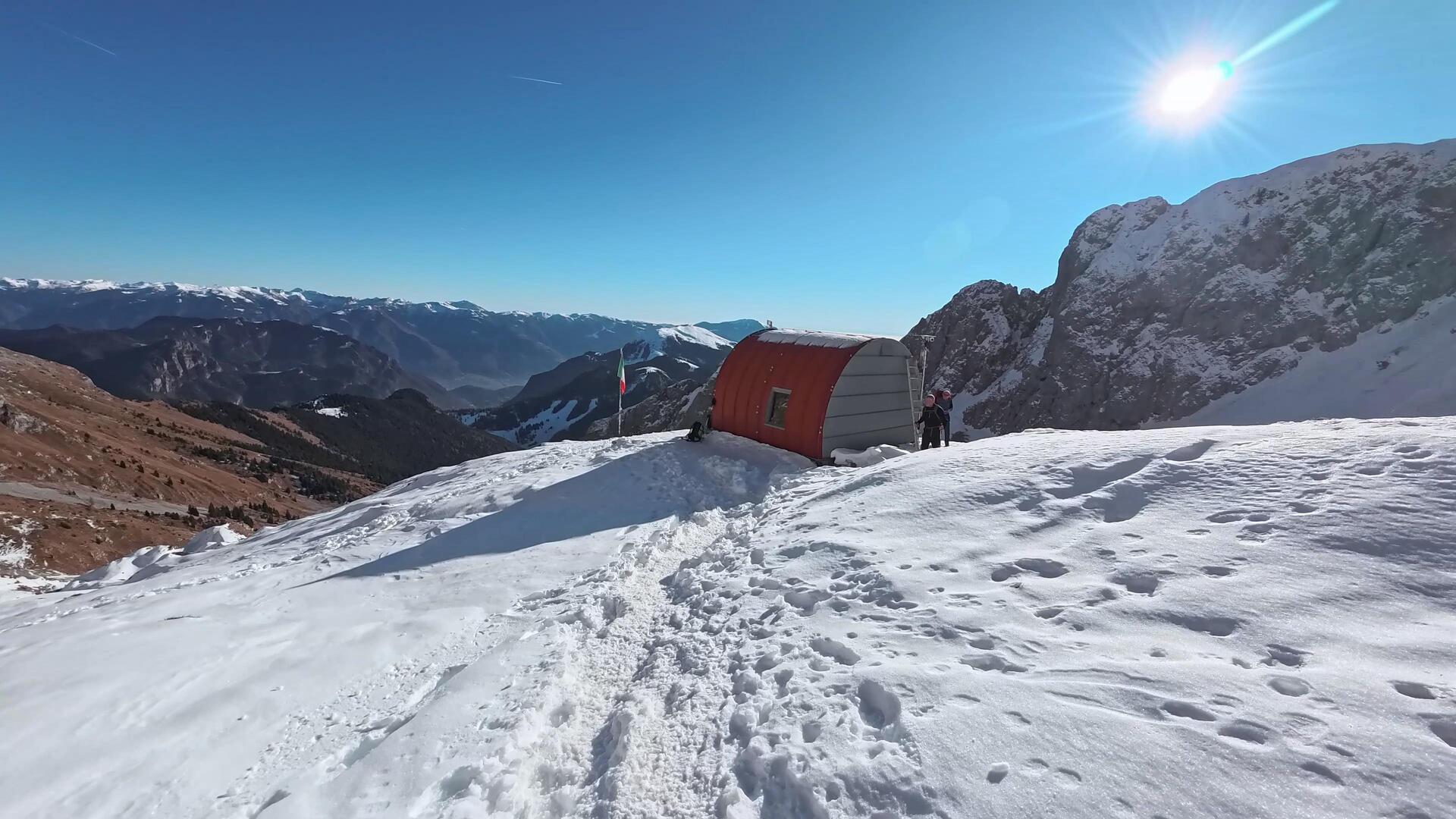 Lasciato il Rifugio Cassinelli, si prosegue seguendo le indicazioni per la Vetta della Presolana, poste a qualche metro più su (il sentiero diretto per il bivacco invece prosegue verso sinistra). Il sentiero, per lo più roccioso, inizia ora a farsi più pendente e seguendo le chiare indicazioni e la traccia si sale fino a ritrovarsi il bivacco ben visibile e a poca distanza sulla sinistra (raggiungibile svoltando sul sentiero). Proseguendo sulla destra e lasciata la Cappella Savina sulla sinistra, si prosegue fino ad incrociare un bivio e nel nostro caso, complice lo scarso innevamento, si decide di puntare verso le Grotte dei Pagani (2.224 m), il punto di attacco per la via normale alla vetta della Presolana.