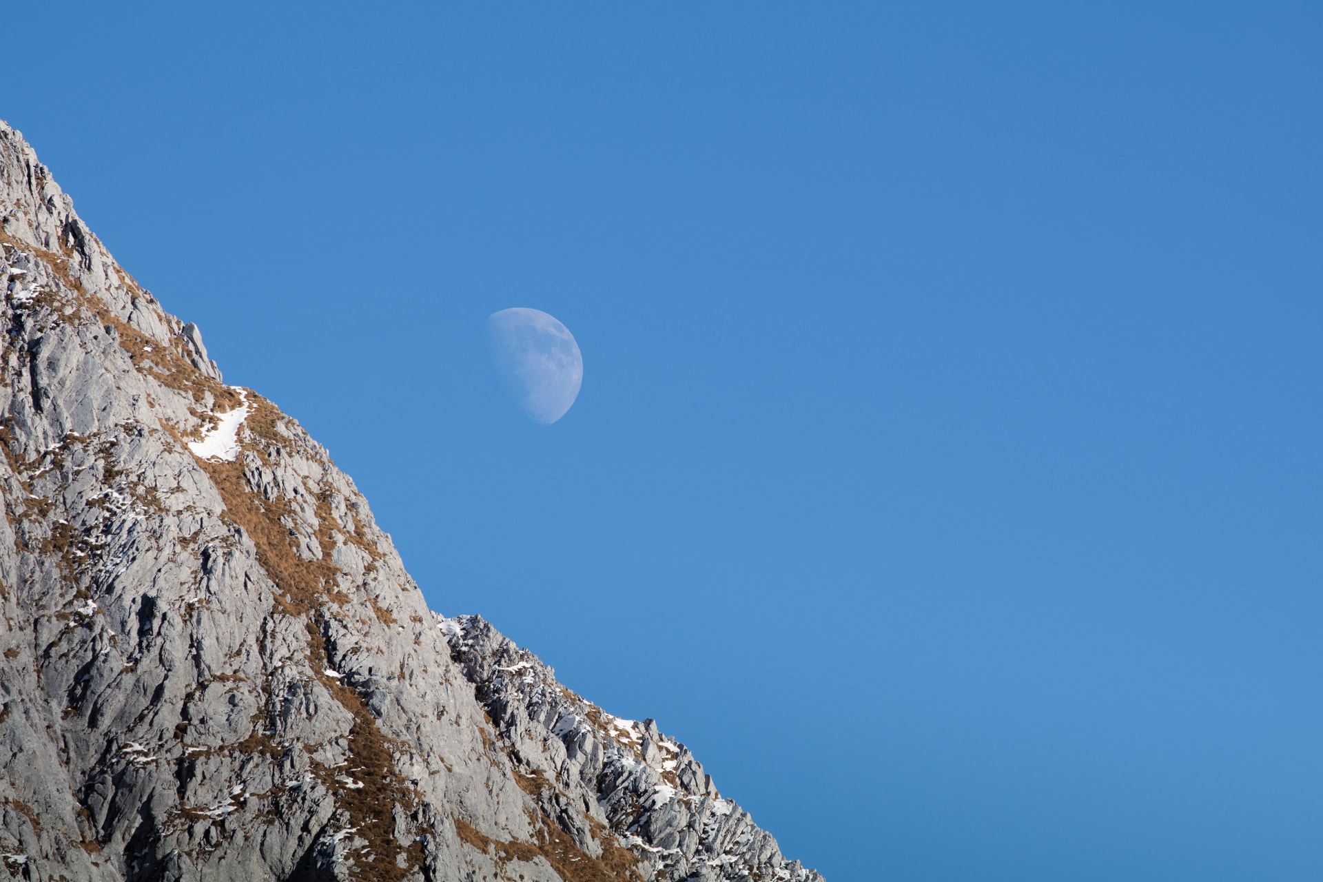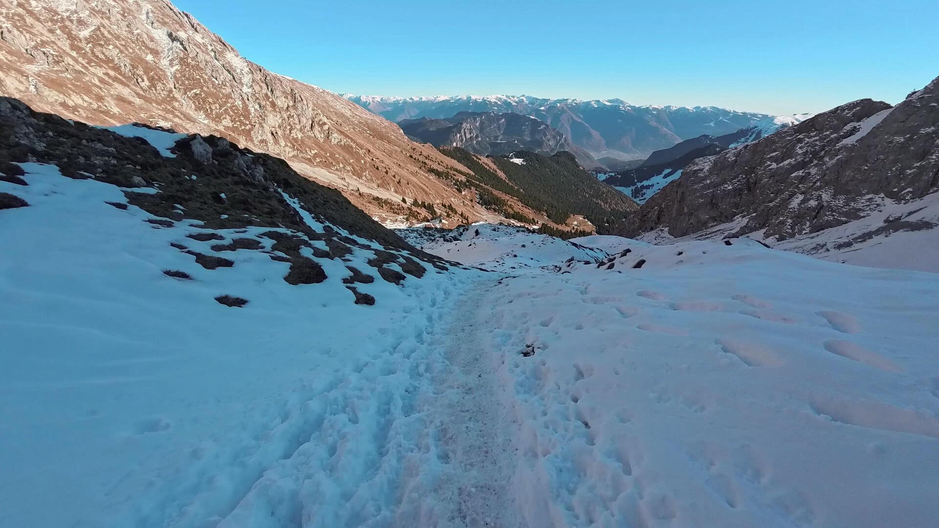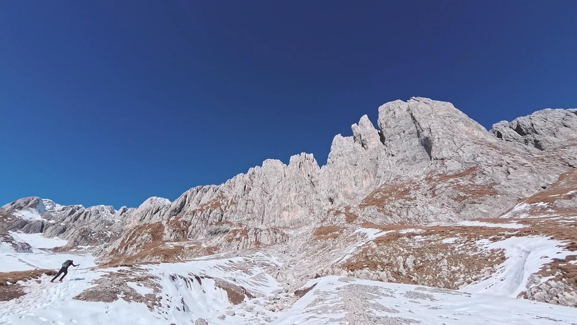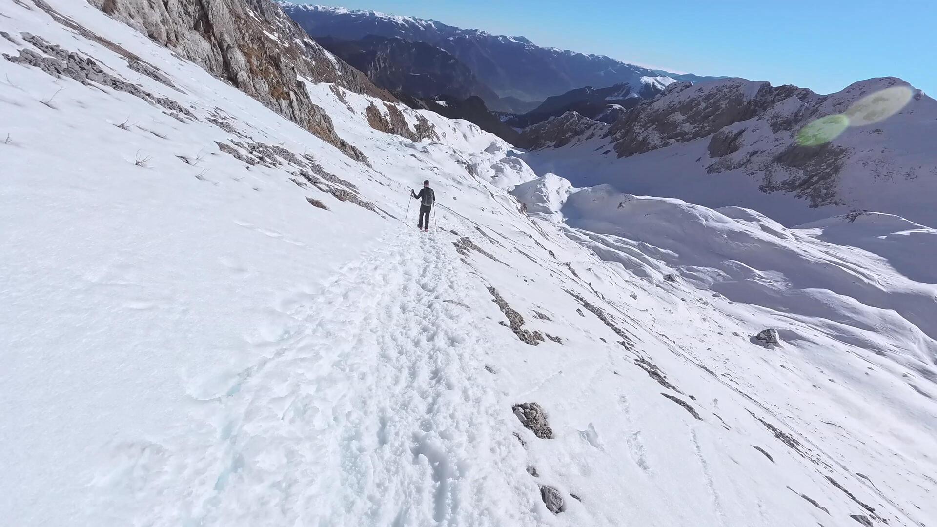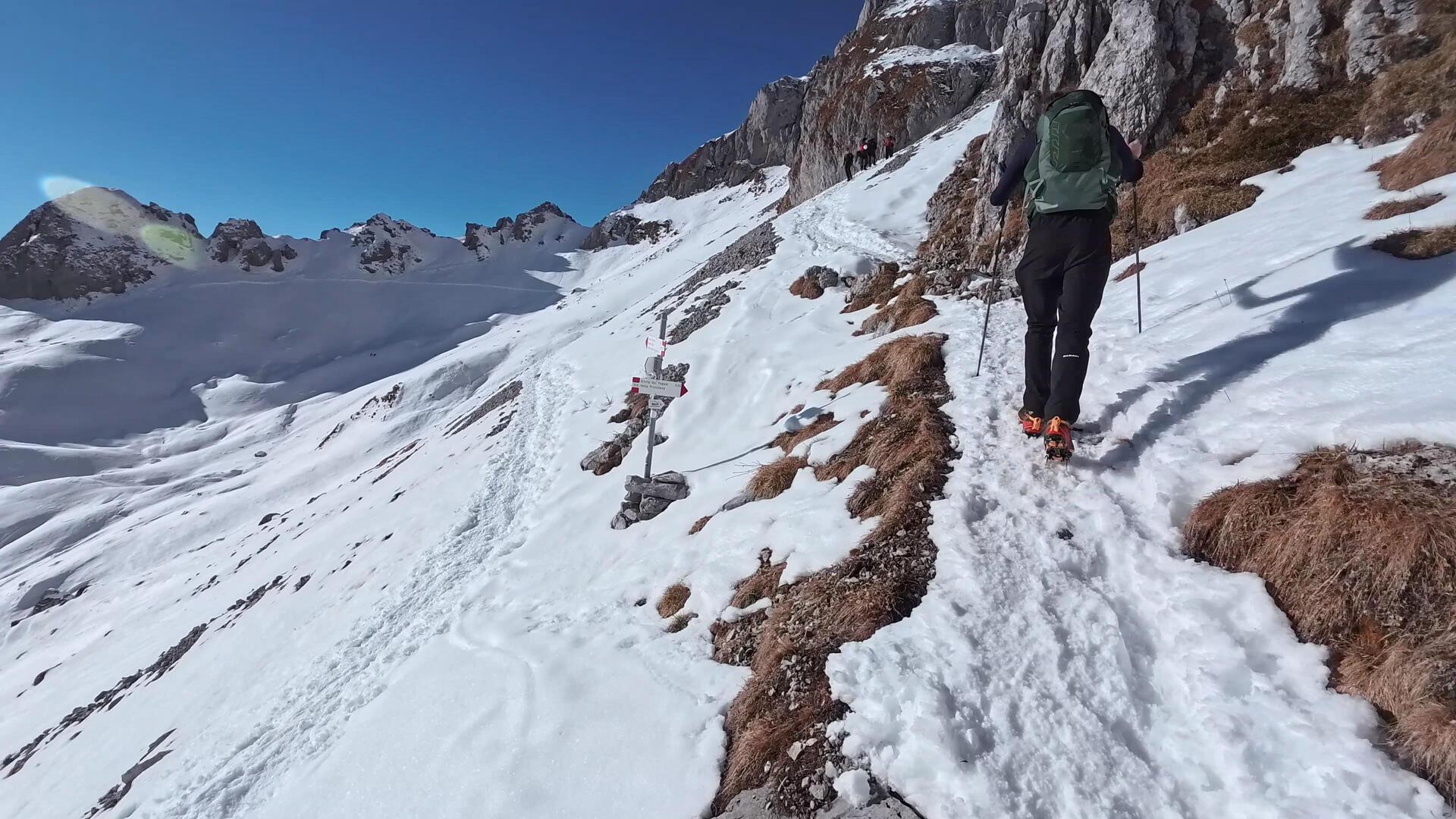 Lasciato il Rifugio Cassinelli, si prosegue seguendo le indicazioni per la Vetta della Presolana, poste a qualche metro più su (il sentiero diretto per il bivacco invece prosegue verso sinistra). Il sentiero, per lo più roccioso, inizia ora a farsi più pendente e seguendo le chiare indicazioni e la traccia si sale fino a ritrovarsi il bivacco ben visibile e a poca distanza sulla sinistra (raggiungibile svoltando sul sentiero). Proseguendo sulla destra e lasciata la Cappella Savina sulla sinistra, si prosegue fino ad incrociare un bivio e nel nostro caso, complice lo scarso innevamento, si decide di puntare verso le Grotte dei Pagani (2.224 m), il punto di attacco per la via normale alla vetta della Presolana.