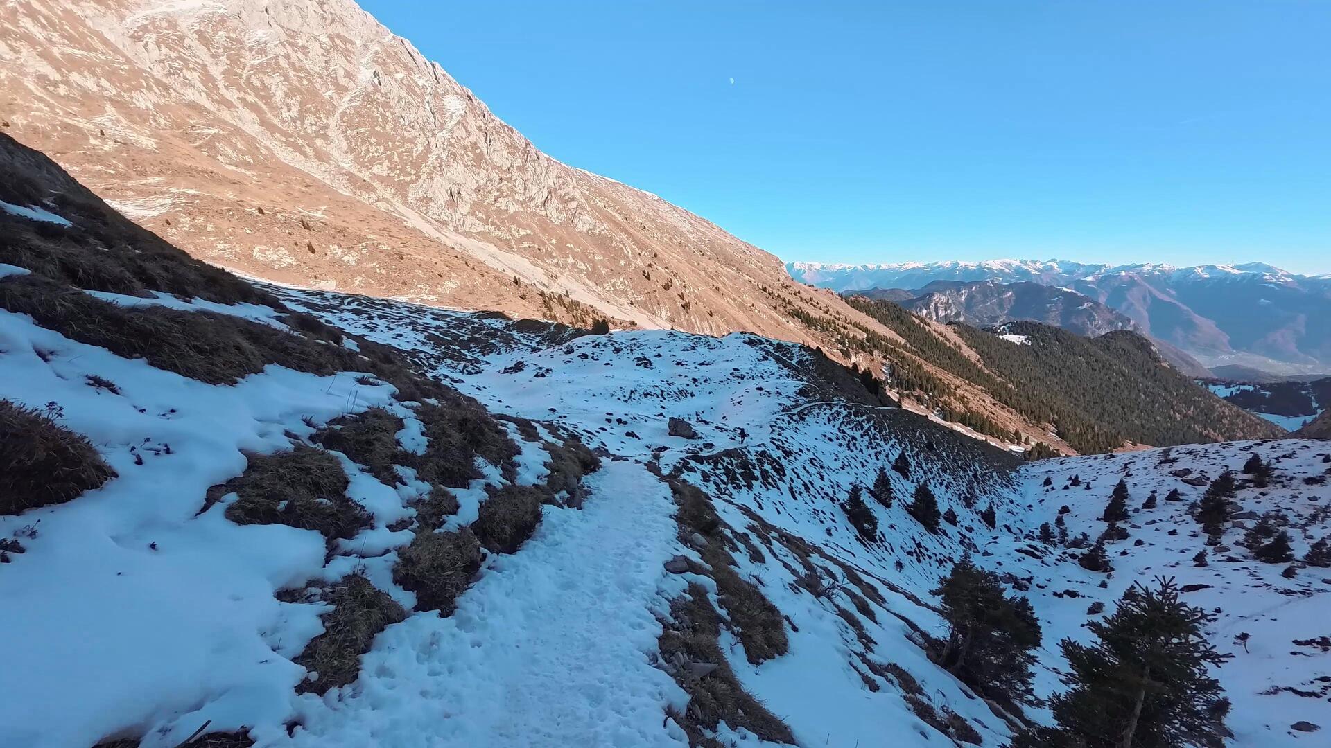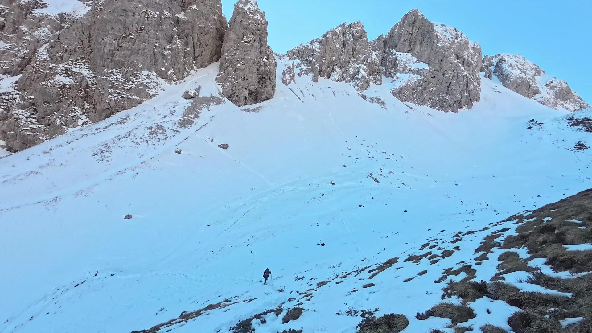 Qui, non avendo al seguito i ramponi classici (ma solo i ramponcini, non idonei su pendenze elevate e ghiacciate), si decide di desistere dall’ascesa alla cima e di ridiscendere verso il bivacco.