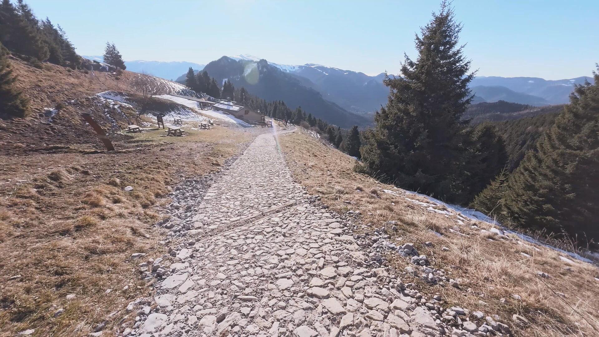 Dalle Grotte dei Pagani, si perde quota ritornando dallo stesso sentiero fatto in salita, fino a raggiungere la conca dove sorge la Cappella Savina e, poco distante, il Bivacco Città di Clusone (2.050 m). La struttura moderna, è posizionata in un punto panoramico eccezionale: alle spalle le rocce verticali della Presolana, di fronte lo sguardo spazia su tutta l’alta Val Seriana e le cime circostanti. Qui è possibile sostare per il pranzo.