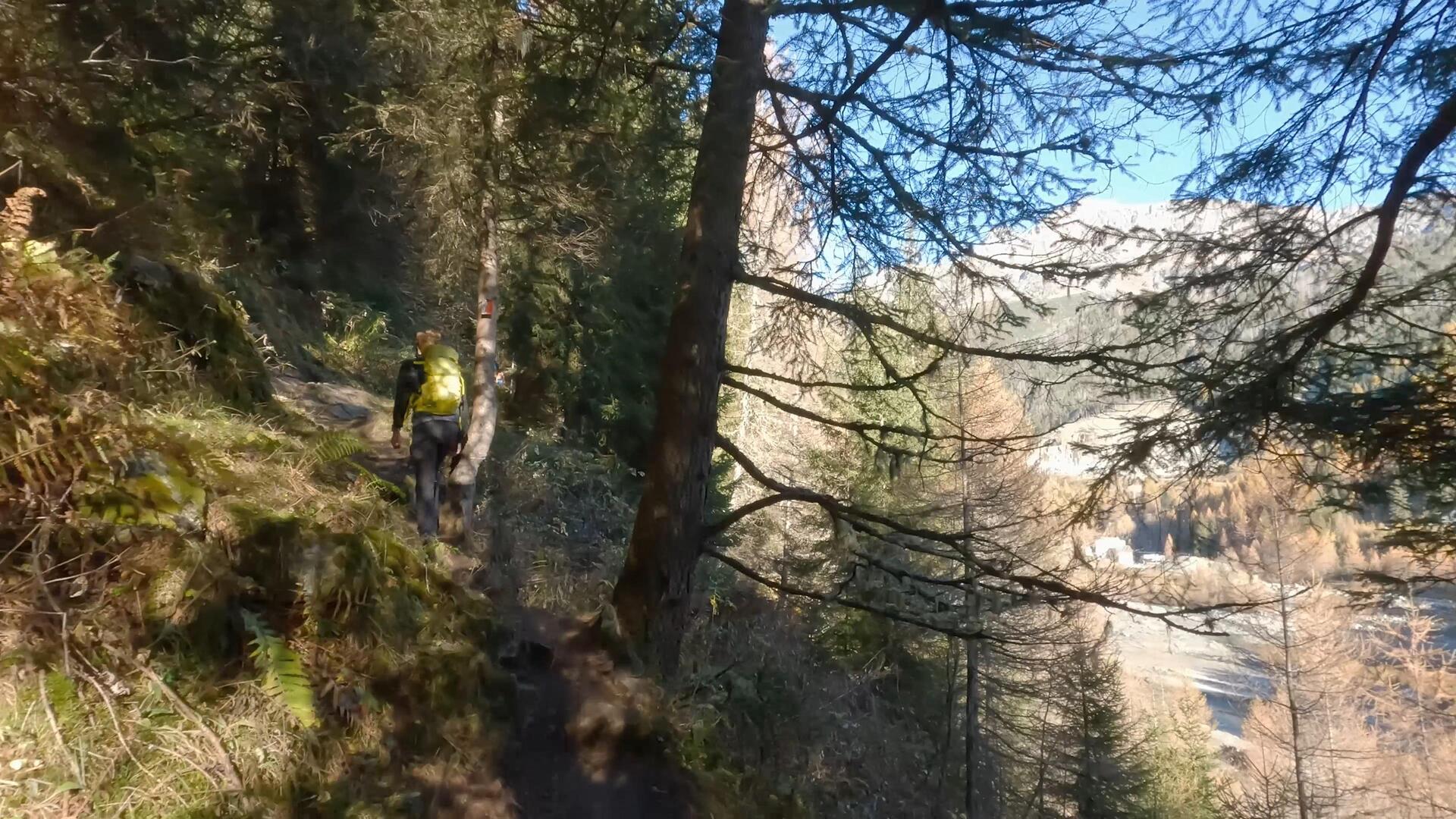 Il sentiero si sviluppa interamente all’interno di un fitto bosco di larici e abeti, disegnando una serie di ripidi tornanti. La pendenza si mantiene costante e impegnativa per tutta la salita, ma il tracciato è sempre ben definito e non presenta difficoltà tecniche o tratti esposti. L’ambiente forestale garantisce ombra per gran parte del percorso, rendendo l’ascesa piacevole anche nelle giornate più calde.