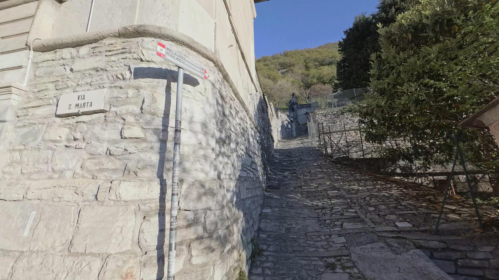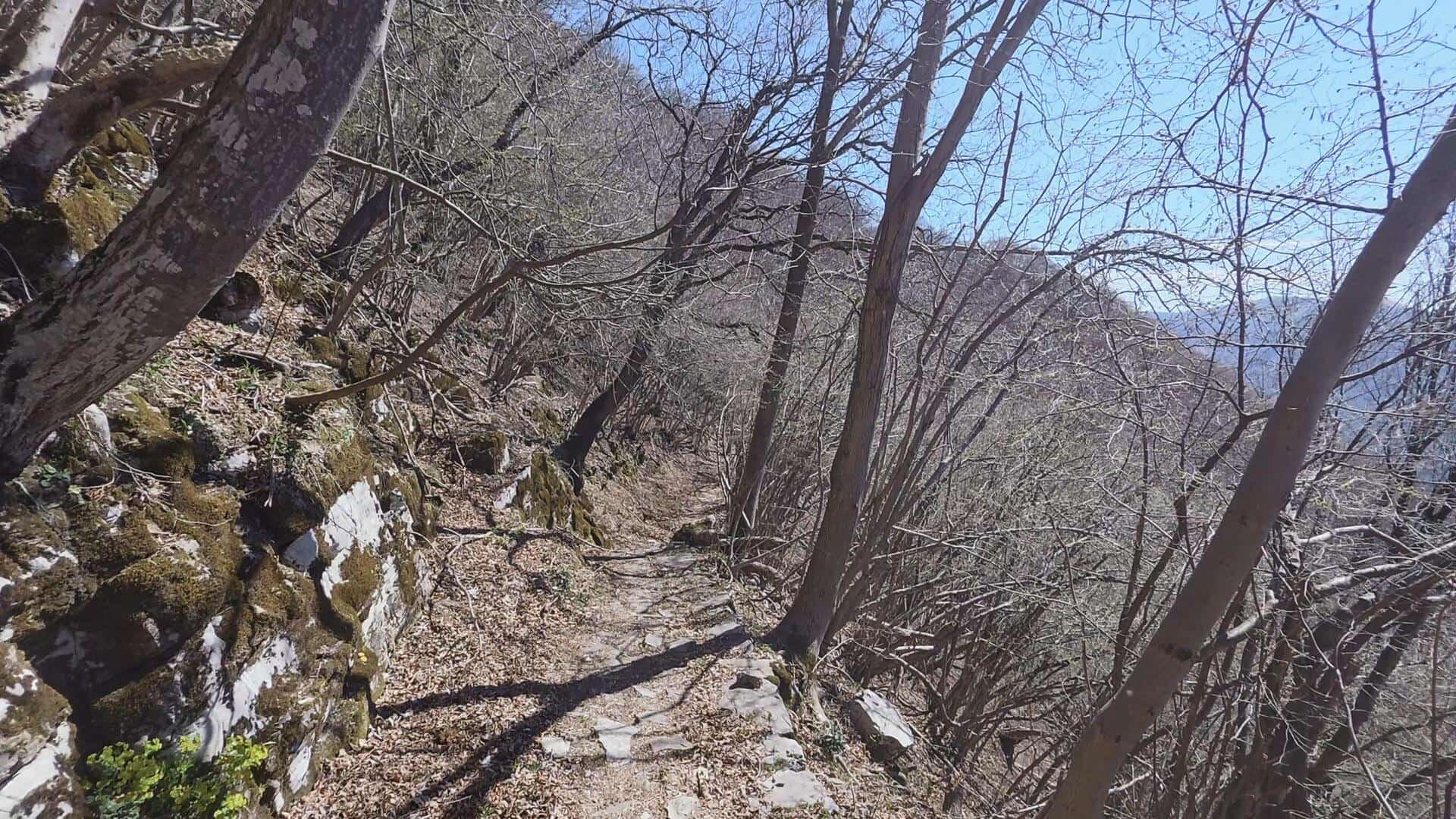 Il sentiero parte senza fare sconti: fin dai primi metri si affronta una salita dritta e decisa su una mulattiera a gradoni che si snoda affiancata da imponenti muri a secco. L’itinerario prende quota molto rapidamente, offrendo costanti squarci panoramici sul lago. Durante l’ascesa nel bosco, superando la località Schirela, è possibile notare i resti delle strutture e dei fabbricati un tempo utilizzati per l’estrazione e il trasporto del sasso di Moltrasio.