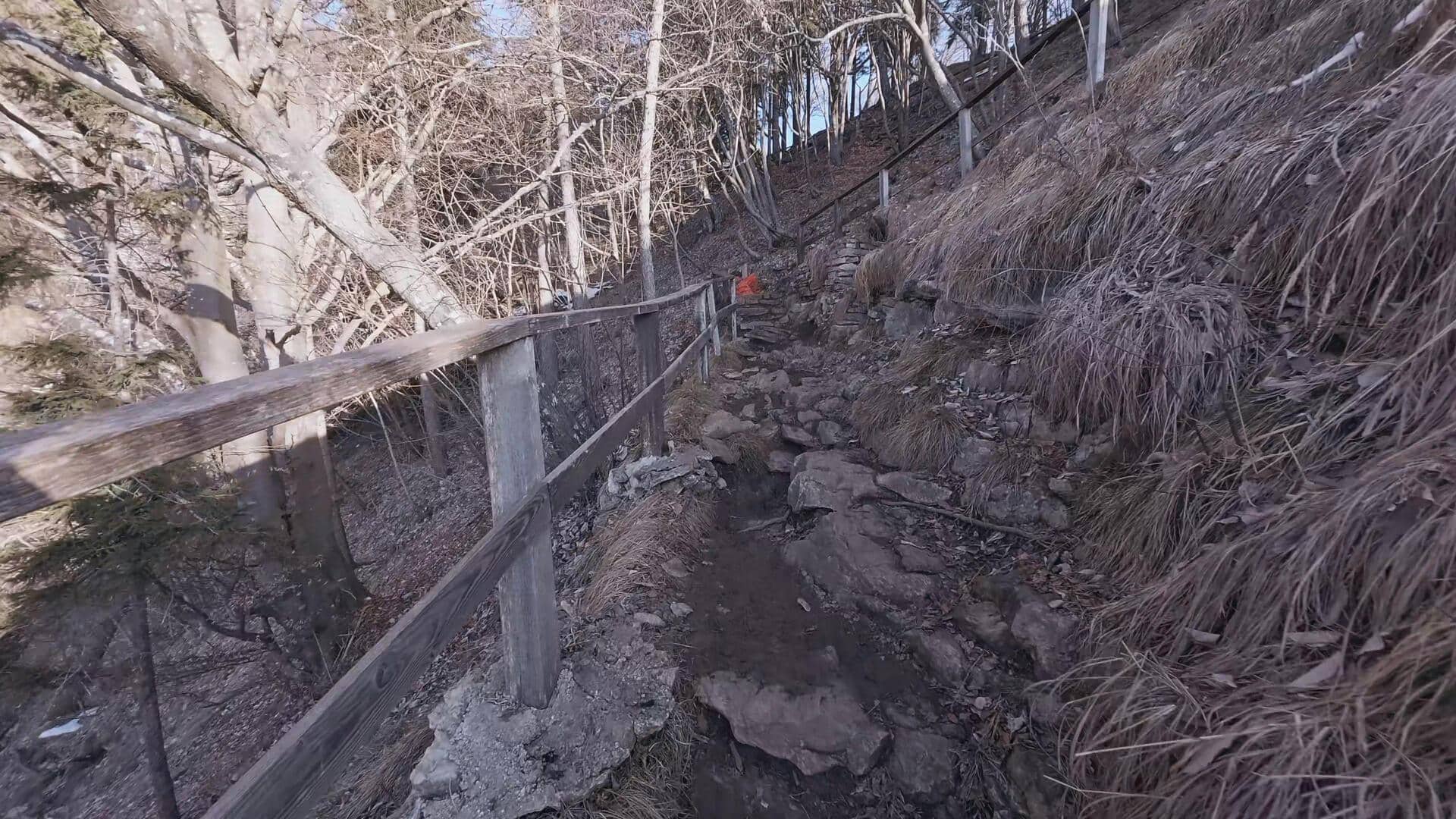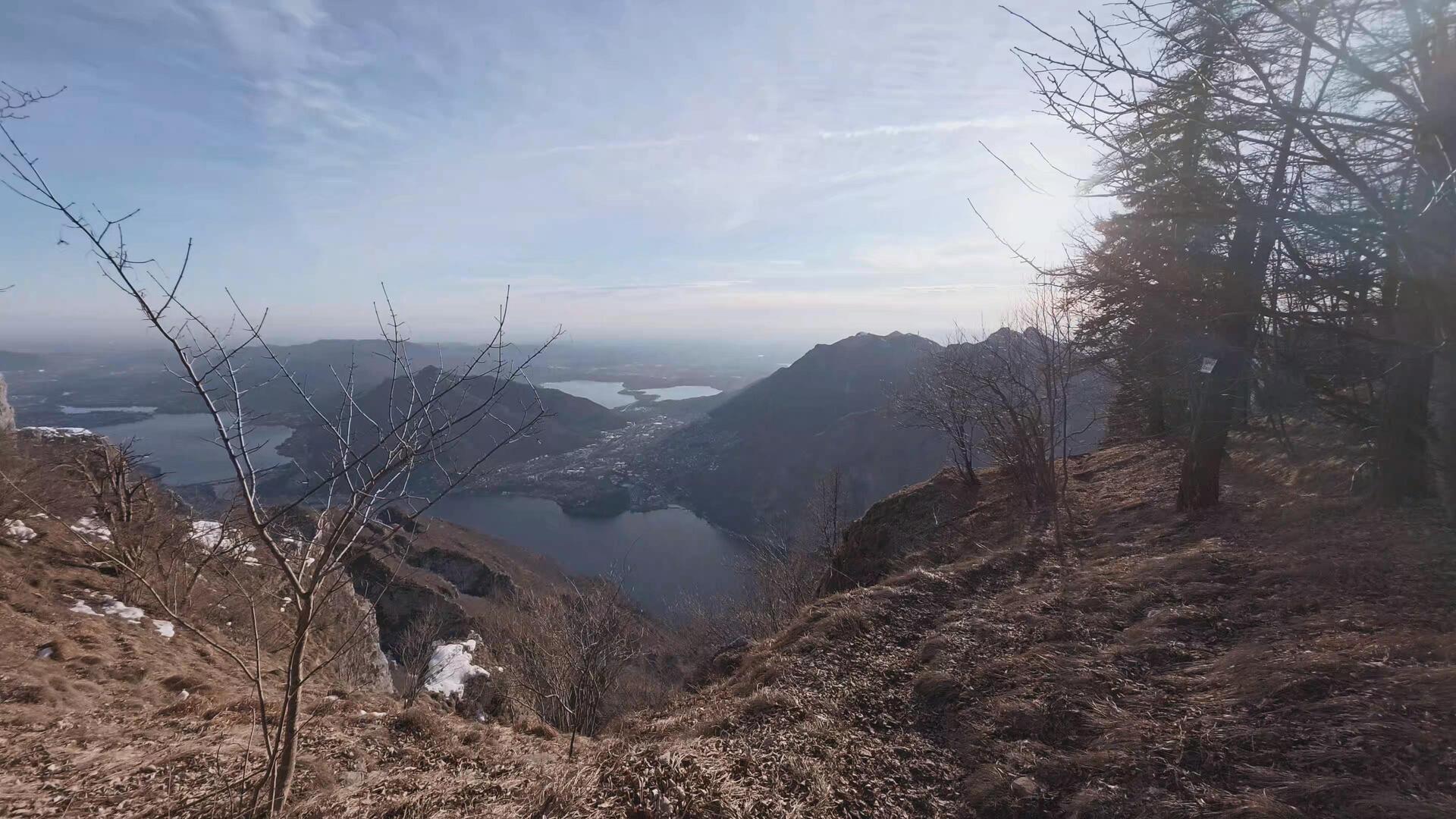 Lasciato il Belvedere, si riprende il sentiero principale e si seguono le indicazioni per il Monte Coltignone. Il tracciato si fa ora un po’ più stretto e tipicamente montano: si cammina lungo la boscosa linea di cresta, affrontando leggeri saliscendi protetti da staccionate in legno nei punti più esposti verso il lago.