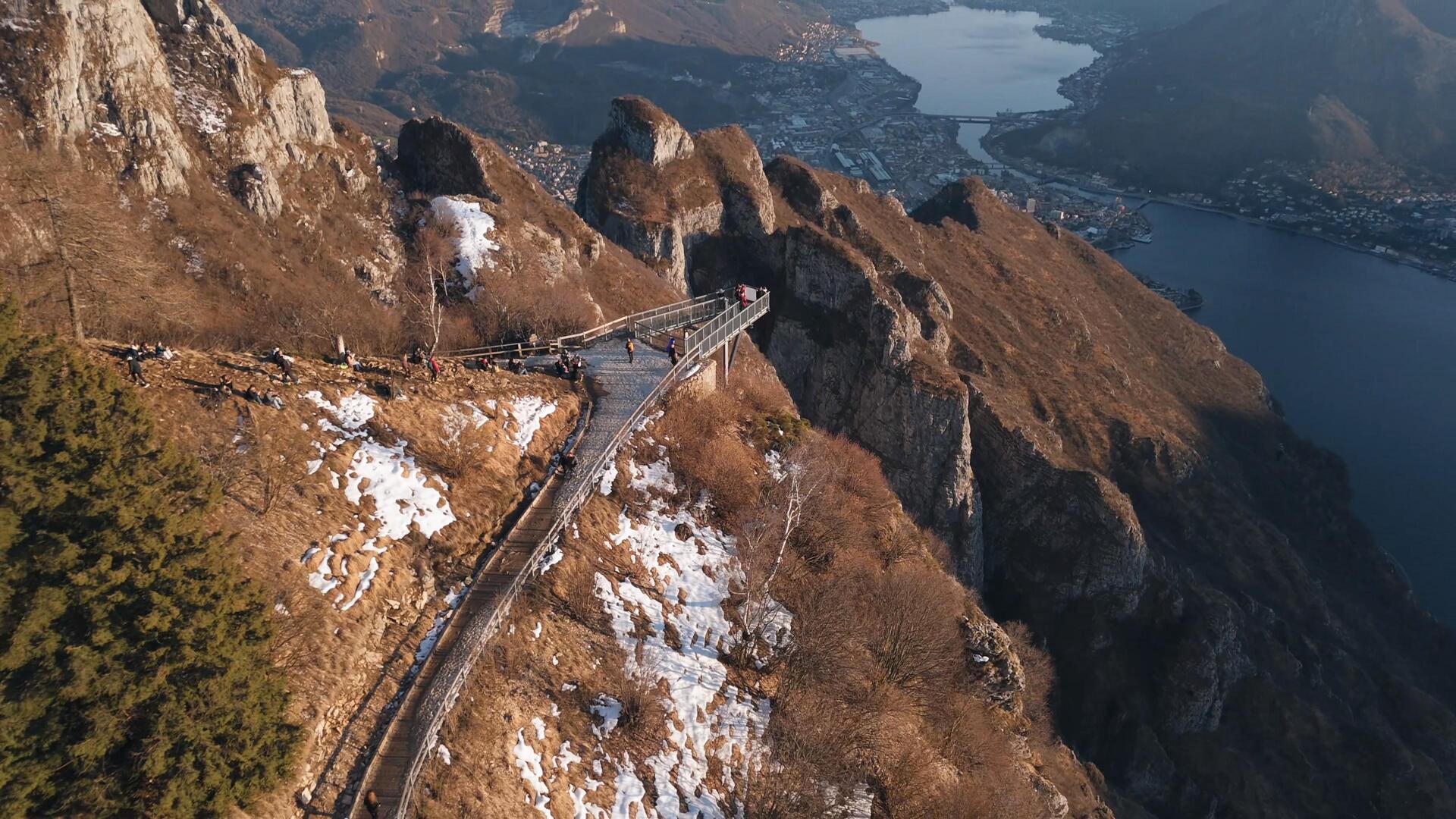 Dopo circa 20-30 minuti (dall’ingresso al parco) si raggiungere il Belvedere (1.350 m). Si tratta di una spettacolare passerella metallica sospesa nel vuoto che regala una vista mozzafiato a strapiombo sulla città di Lecco, sul lago, sul Monte Barro, Corni di Canzo e Monte Moregallo. Un primo assaggio del panorama che ci aspetterà più in alto.
