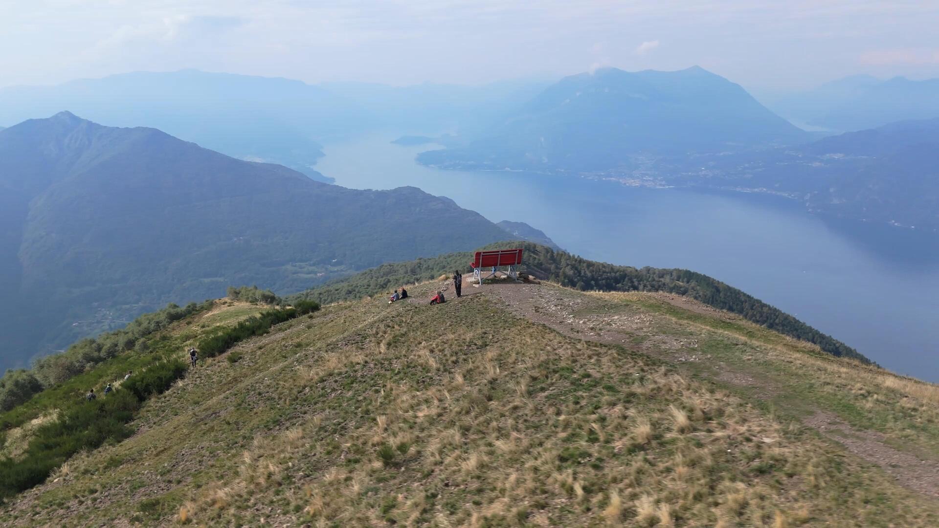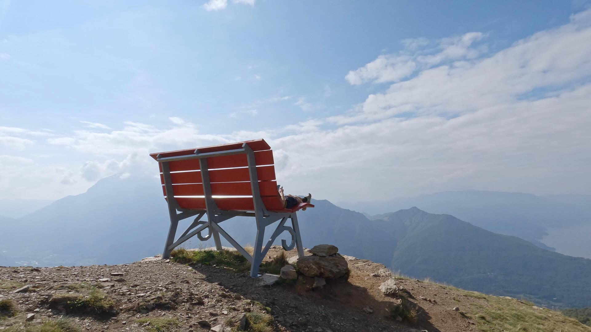 Dalla vetta del Monte Croce di Muggio, si ripercorre il sentiero che riporta alla Baita Comolli, dal cui fianco, si scende seguendo un sentiero verso sud-ovest, diretto a Prà Bolscino (circa 1550 m s.l.m.). Il percorso, ben segnato, attraversa un pendio erboso e raggiunge Prà Bolscino in circa 15 minuti, riconoscibile per un prato erboso, un cartello e un ripetitore. Da qui, si prosegue a sinistra sul traverso pressochè pianeggiante per altri 15 min, raggiungendo l’Alpe Chiaro (1533 m s.l.m.), dove si trova la rossa Panchina Gigante del Big Bench Community Project. Questa installazione panoramica offre una vista spettacolare sul Lago di Como, il Triangolo Lariano e la punta di Bellagio. La discesa dalla vetta alla Panchina Gigante richiede circa 30 minuti, con una pausa ideale per foto e relax.