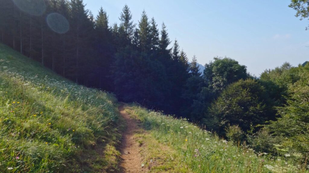 Dai Piani d’Erna, si scende lungo la strada asfaltata per circa 300 m fino alla Bocca d’Erna (1.291 m s.l.m.), un prato con panchine e cartelli. Qui, si imbocca il sentiero 5 (indicazioni Rifugio Azzoni/Passo del Fò), che inizia in leggera discesa attraverso un bosco di pini. Il percorso, agevole e ombreggiato, attraversa pendii erbosi e rocciosi con vista su Lecco, Monte Barro e Pizzo d’Erna. Dopo circa 20 minuti, si supera un passaggio leggermente esposto con catena e alcuni canali rocciosi, raggiungendo l’incrocio con il sentiero 1 (1.150 m s.l.m.). Da qui, si segue il sentiero 1 in salita, che esce dal bosco presso la Bedoletta (1.320 m s.l.m.), un crocifisso su un balcone naturale con panorama su Lago di Como e Grigne. La salita fino alla Bedoletta richiede circa 45′ dai Piani d’Erna.